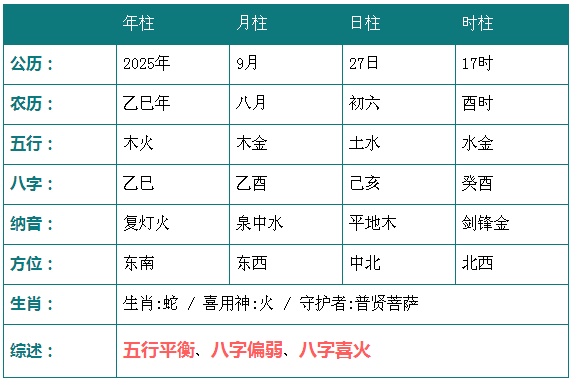 2025年9月27日出生的男孩女孩五行属什么缺什么