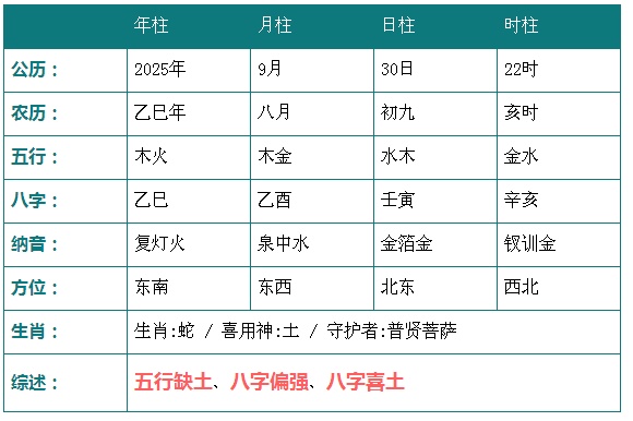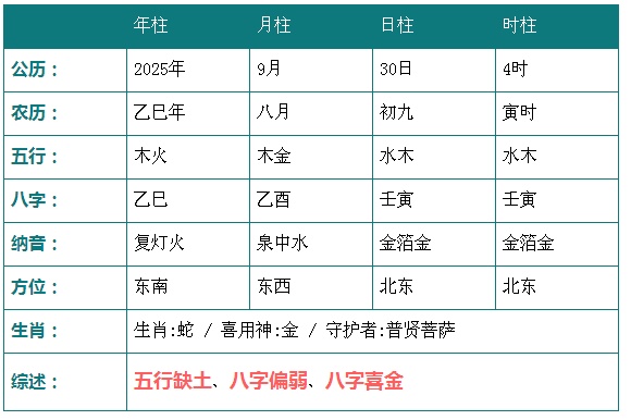 2025年9月30日出生的男孩女孩五行属什么缺什么