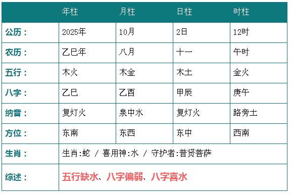 2025年10月2日12时八字五行分析: