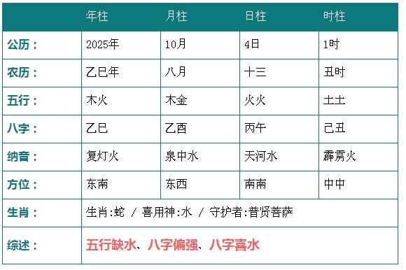 2025年10月4日1时八字五行分析: