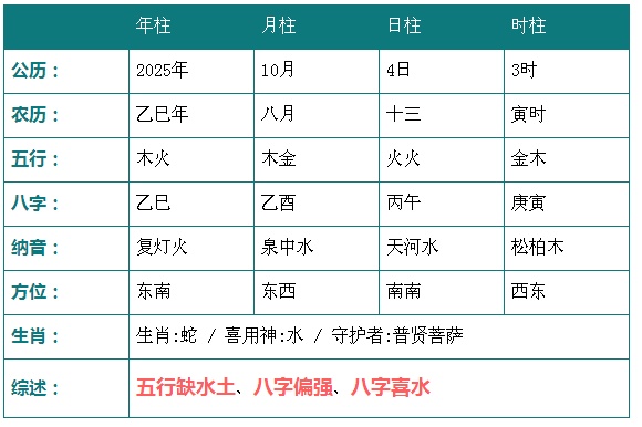 2025年10月4日3时八字五行分析: