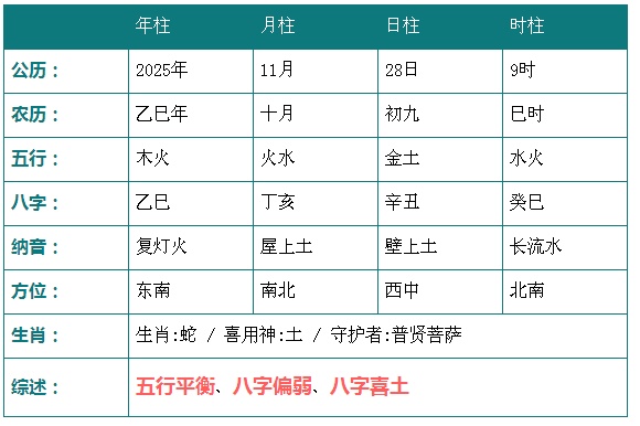 2025年11月28日9时八字五行分析: