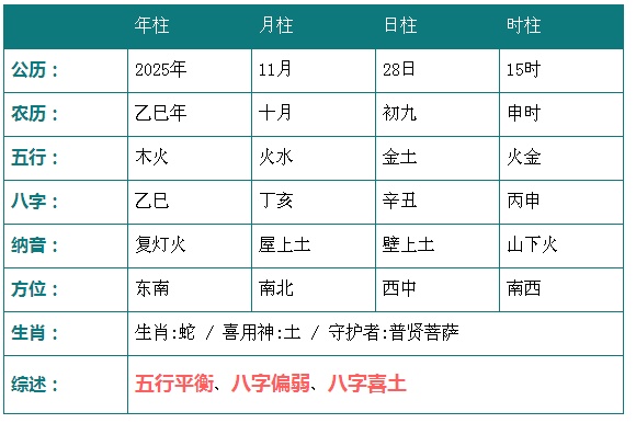2025年11月28日15时八字五行分析: