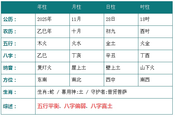 2025年11月28日18时八字五行分析: