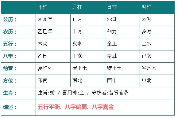 2025年11月28日22时八字五行分析: