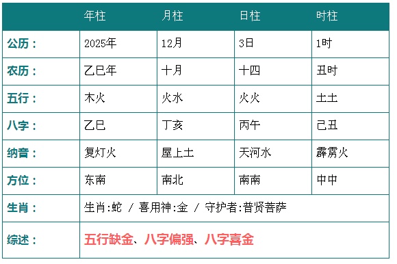 2025年12月3日1时八字五行分析: