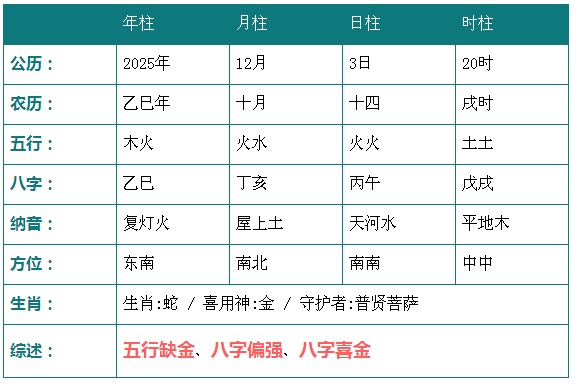 2025年12月3日19时八字五行分析: