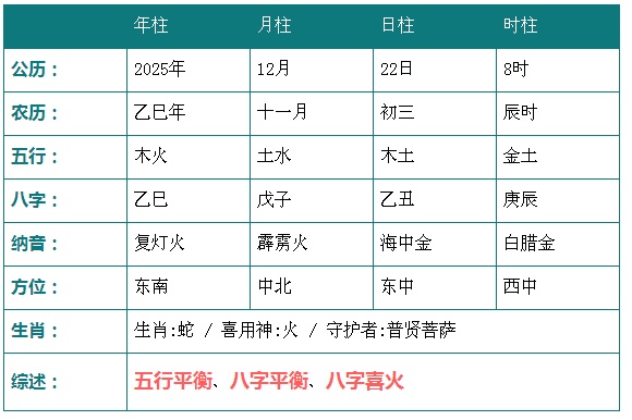 2025年12月22日3时八字五行分析: