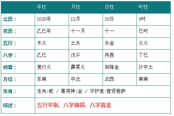 2025年12月30日9时八字五行分析: