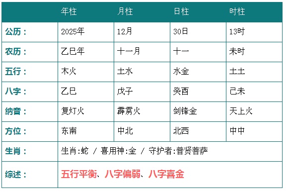 2025年12月30日13时八字五行分析: