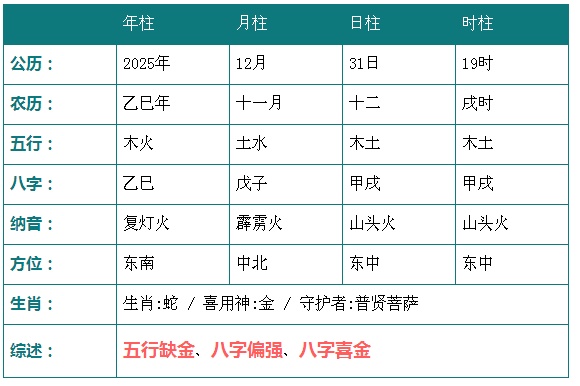 2025年12月31日出生的男孩女孩五行属什么缺什么