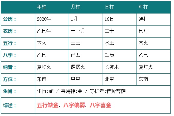 2026年1月18日9时八字五行分析: