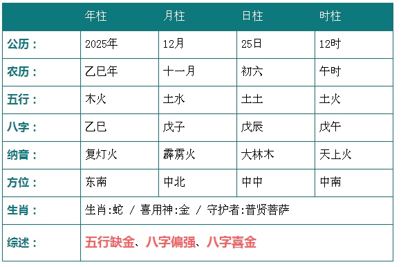2025年12月25日出生的男孩女孩五行属什么缺什么